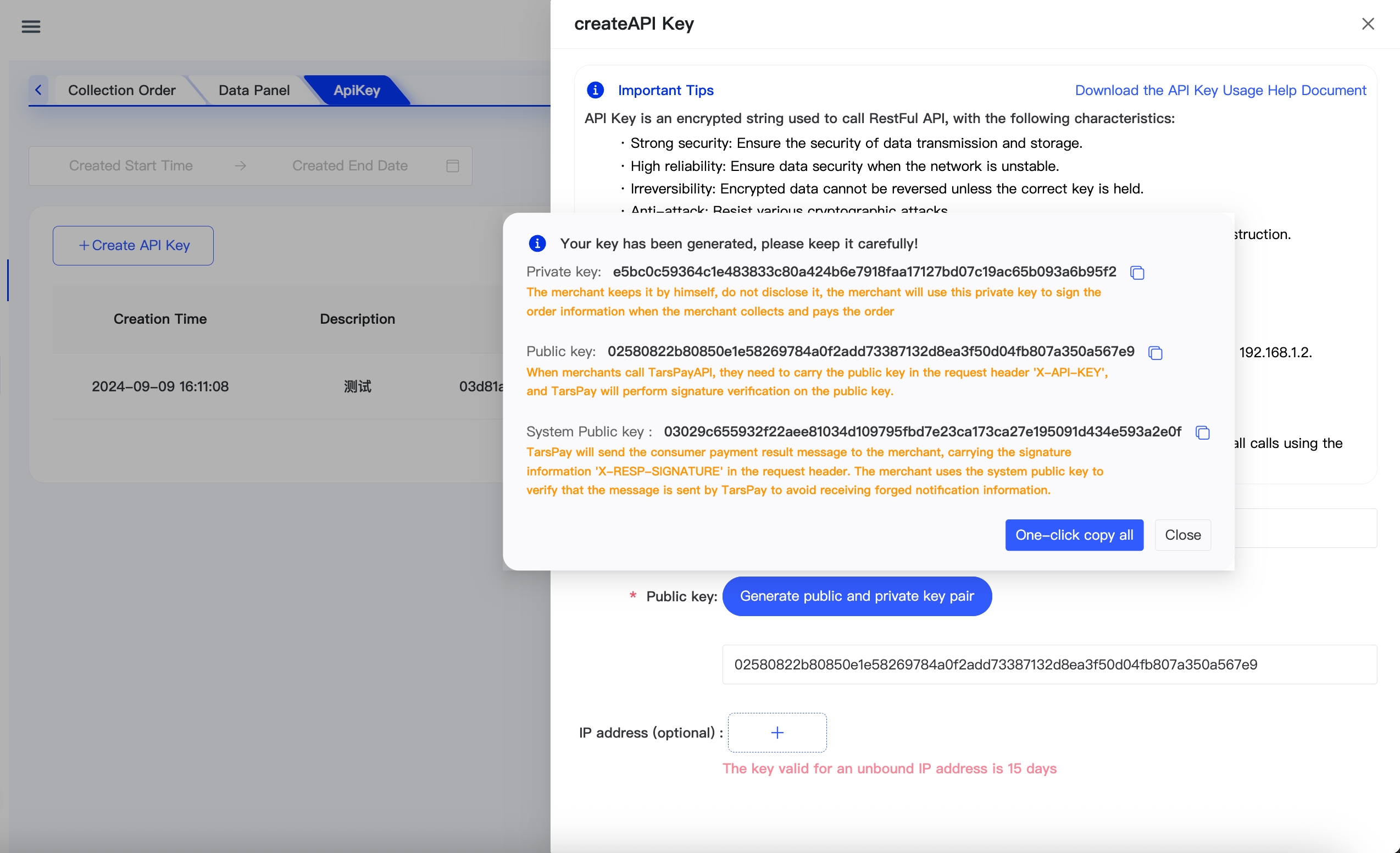 正式上线阶段, 我方强烈建议贵方绑定服务器IP地址, 未绑定IP地址的 APIKey 仅能使用 15天, 修改 APIKey 绑定服务器 IP 后重新生效。